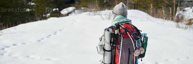 Молодая взрослая женщина путешествует по снегу, неся кемпинговое оборудование