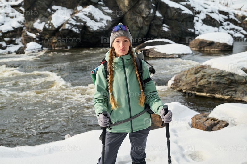 Портрет молодой взрослой женщины, путешествующей рядом со Снежной рекой зимой