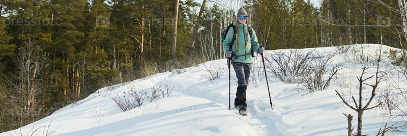 Молодая взрослая женщина, путешествующая по тропе в снежном лесу зимой