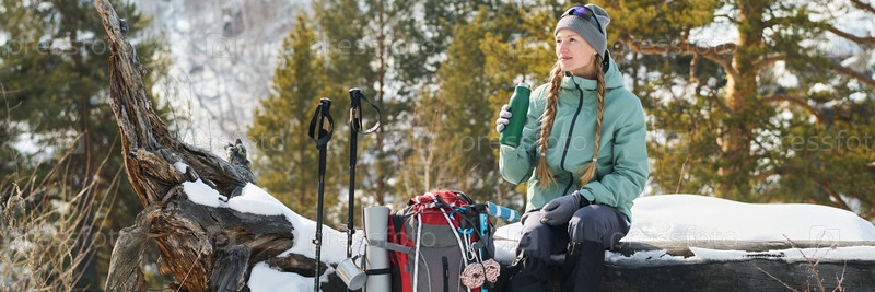 Молодая женщина отдыхает на открытом воздухе, пьёт из термоса во время зимнего похода