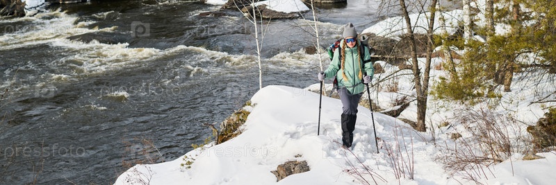 Молодая взрослая женщина путешествует рядом со снежным берегом реки в зимней пустыне