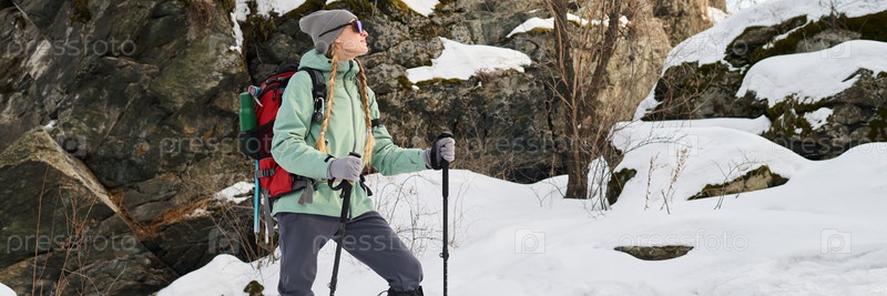 Молодая взрослая женщина путешествует с рюкзаком в снежном горном ландшафте