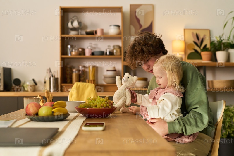 Подросток помогает маленькой девочке играть наполненной игрушкой