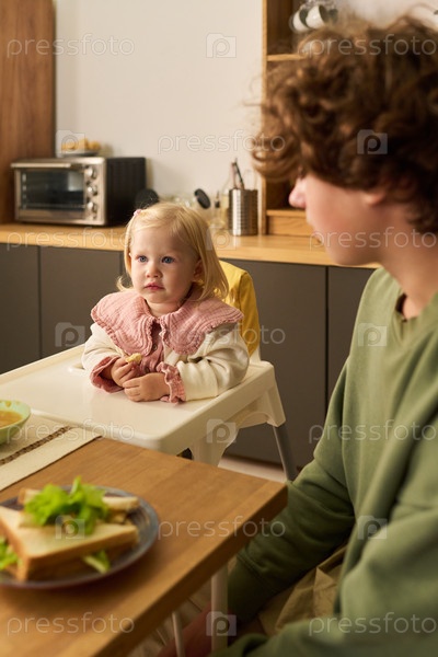 Девочка-подросток сидит в высоком кресле и ест рядом с подростковым мальчиком