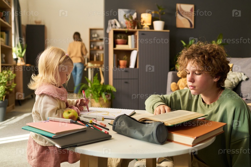 Мальчик-подросток учится, а девочка-ребенок рисует в помещении