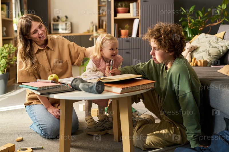 Молодая женщина улыбается, глядя на подростка, рисующего с малышом