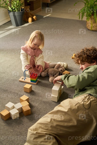 Девочка играет с деревянными образовательными игрушками рядом с молодым взрослым мужчиной