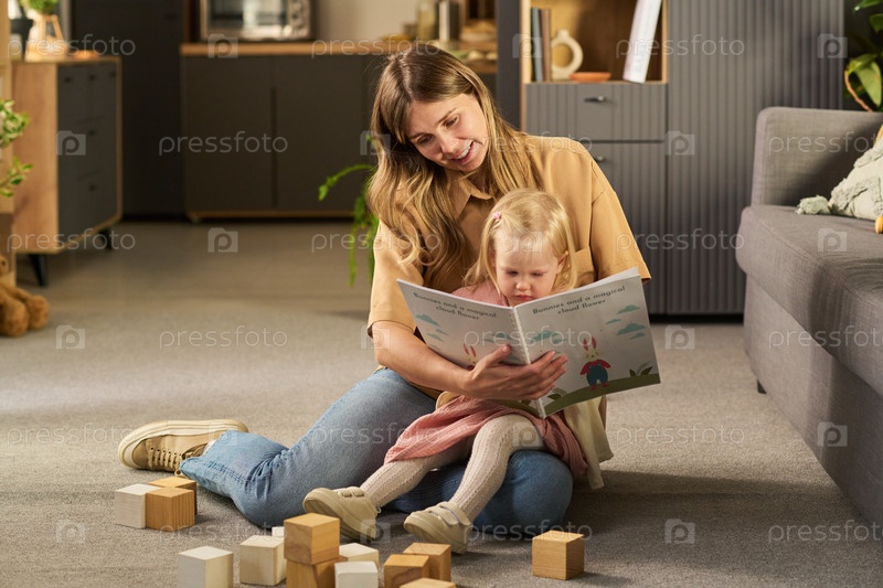 Молодая взрослая женщина читает сказку маленькой девочке в помещении