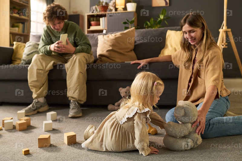 Мать смотрит, как маленькая дочь играет с тедди-медведем в помещении