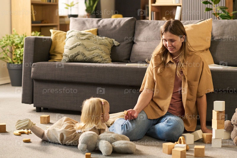 Молодая женщина улыбается, играя с ребенком в помещении