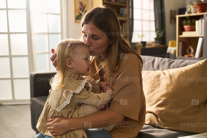 Молодая взрослая женщина обнимает и целует ребенка в помещении
