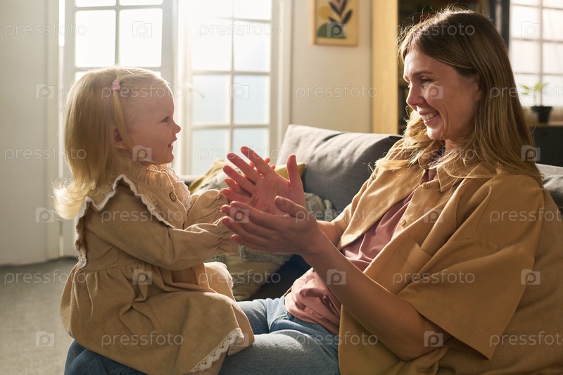 Молодая взрослая женщина хлопает в ладоши с улыбающейся маленькой девочкой внутри