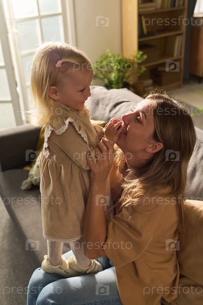 Молодая женщина улыбается, когда держит малыша в помещении