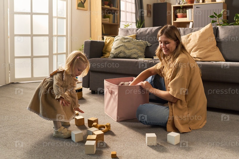 Молодая женщина улыбается, глядя на ребенка, играющего с деревянными блоками