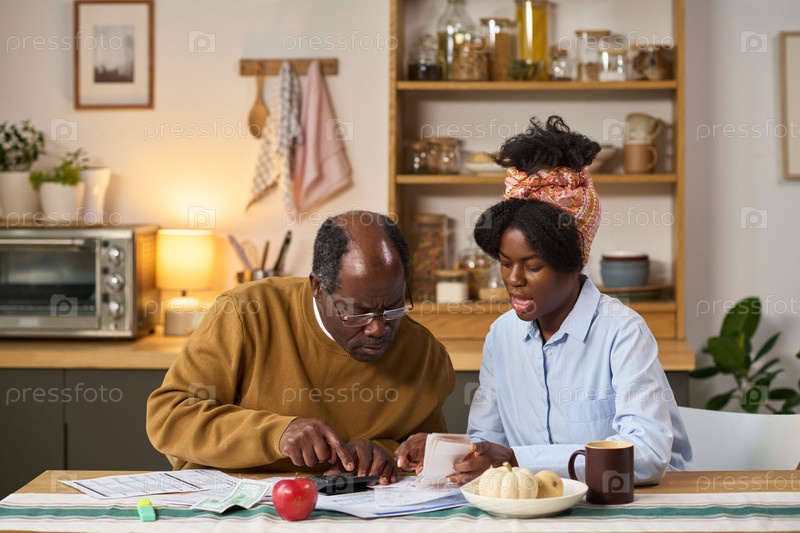 Американский мужчина среднего возраста и молодая американская женщина рассчитывают налоги