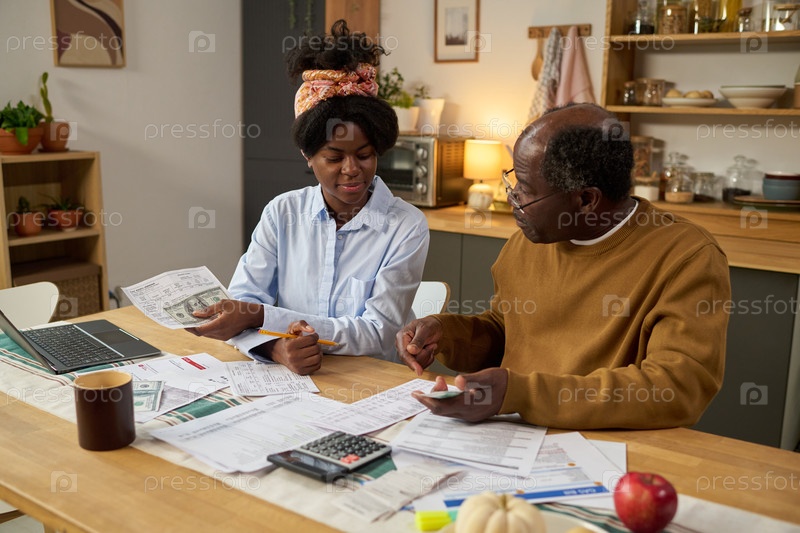 Чернокожий мужчина среднего возраста и молодая взрослая черная женщина рассчитывают налоговые платежи