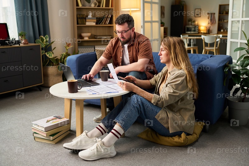 Молодая взрослая пара просматривает налоговые документы и использует ноутбук вместе