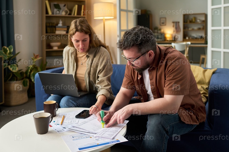 Молодые взрослые вместе просматривают финансовые документы и рассчитывают налоги