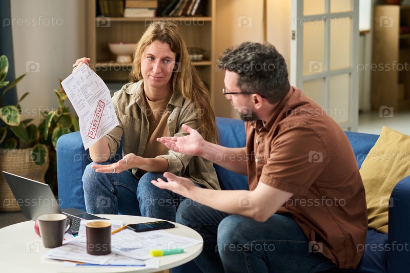 Молодая женщина показывает налоговый счет, споря с мужчиной