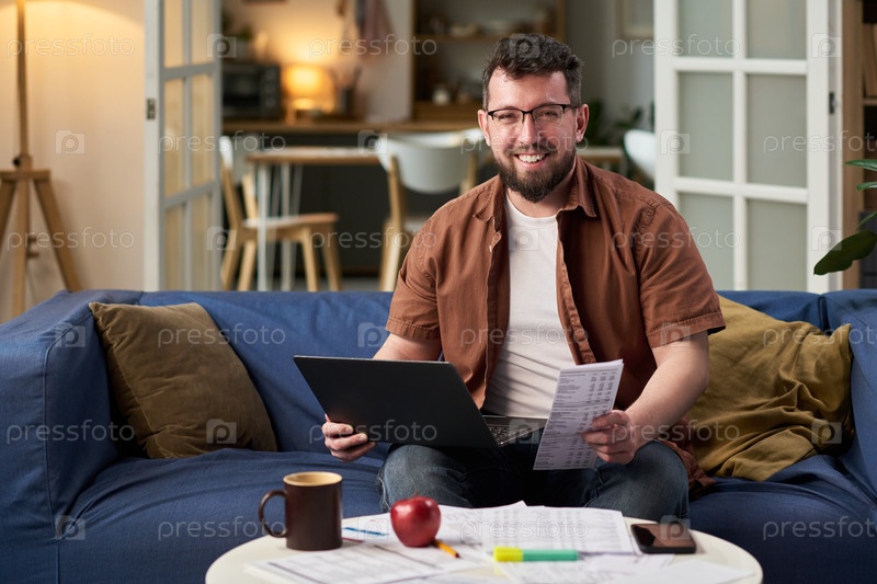 Молодой взрослый мужчина улыбается, подавая налоги с помощью ноутбука дома