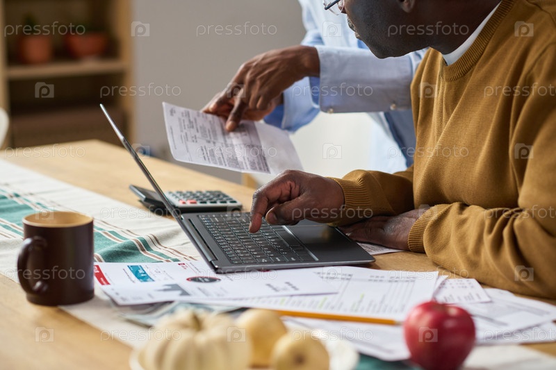 Чернокожий мужчина средних лет просматривает налоговые документы и вводит данные на ноутбуке
