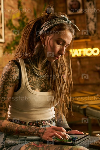 Татуированная молодая женщина просматривает цифровое портфолио в студии