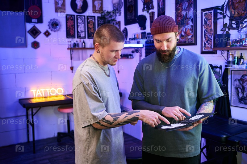 Молодые мужчины обсуждают дизайн татуировок в современной студии