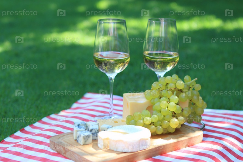 Разные сорта сыра, виноград и бокалы вина на столе