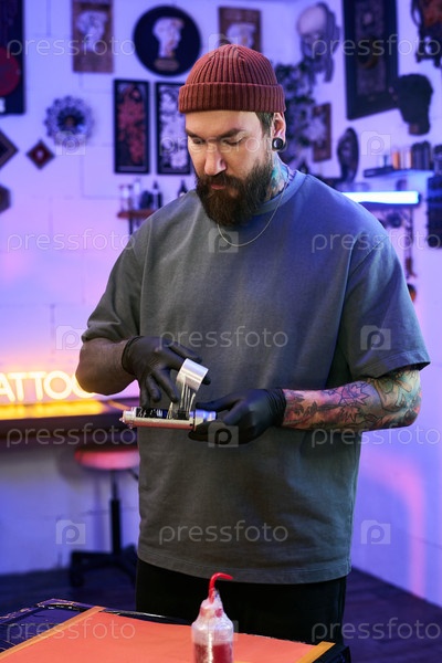 Молодой взрослый мужчина готовит тату-машину в современной студии