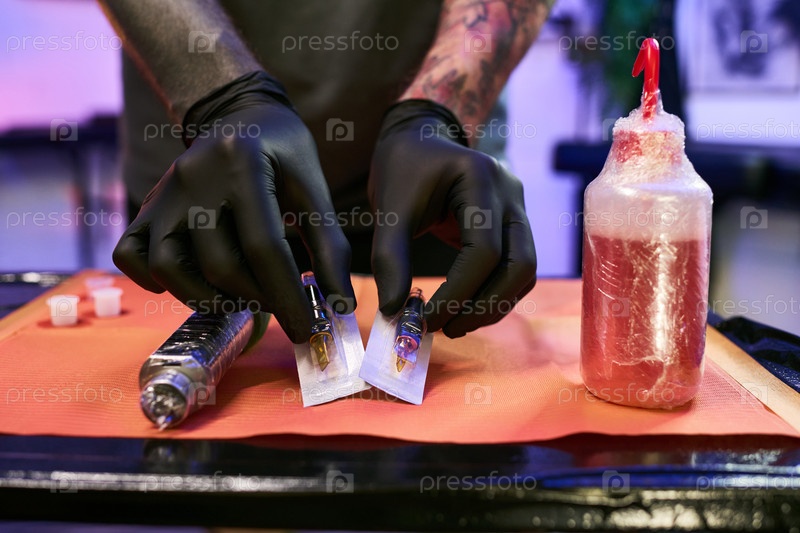 Татуированный молодой взрослый мужчина готовит тату-машину в профессиональной студии