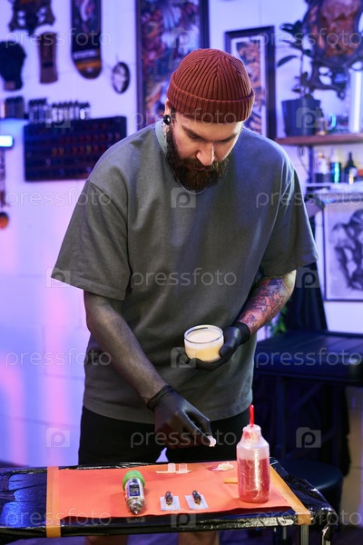 Молодой человек готовит оборудование для татуировок в современной студии