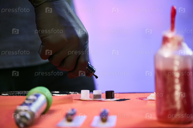 Молодой человек готовит татуировочную чернила с перчаточной рукой в студии