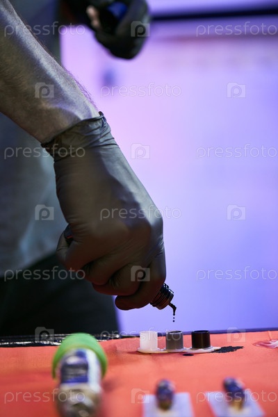 Молодой взрослый мужчина готовит татуировочную чернила для профессиональной татуировки