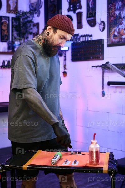 Татуированный молодой человек устраивает инструменты перед тату-сессией
