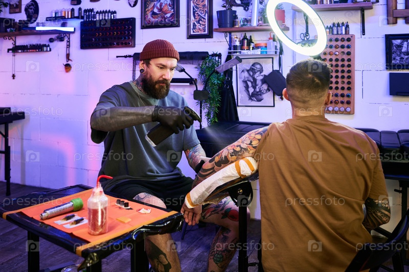 Молодой взрослый мужчина татуирует руку молодого взрослого человека в студии