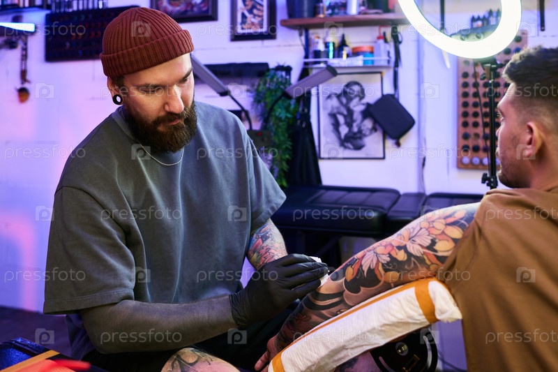 Художник-татуировщик молодого взрослого мужчины, работающий на татуированной руке клиента