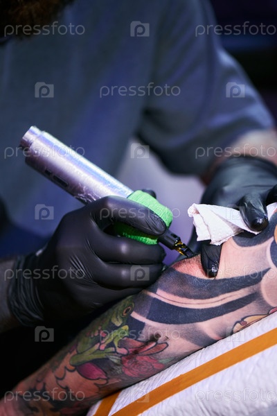 Художник-татуировщик молодого взрослого мужчины создает татуировку на предплечье