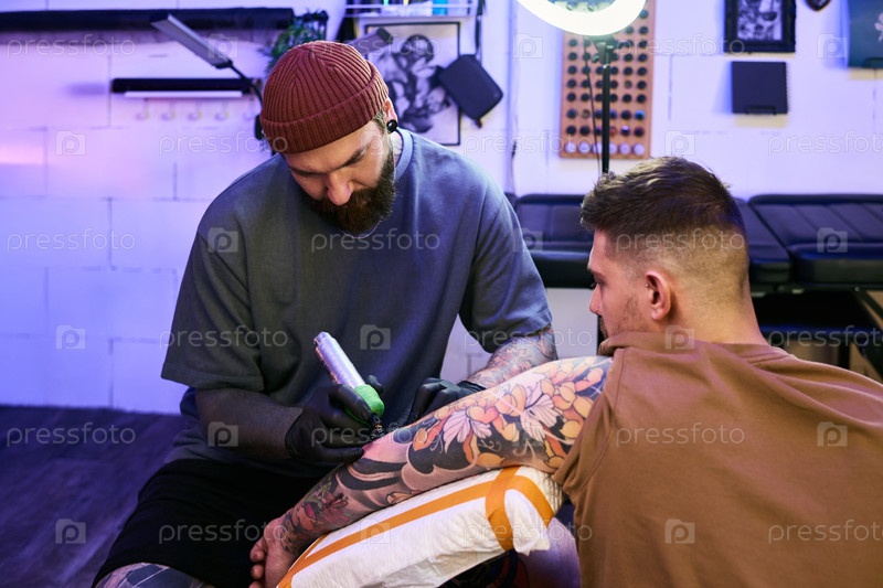 Молодой взрослый мужчина татуирует руку молодого взрослого мужчины в помещении