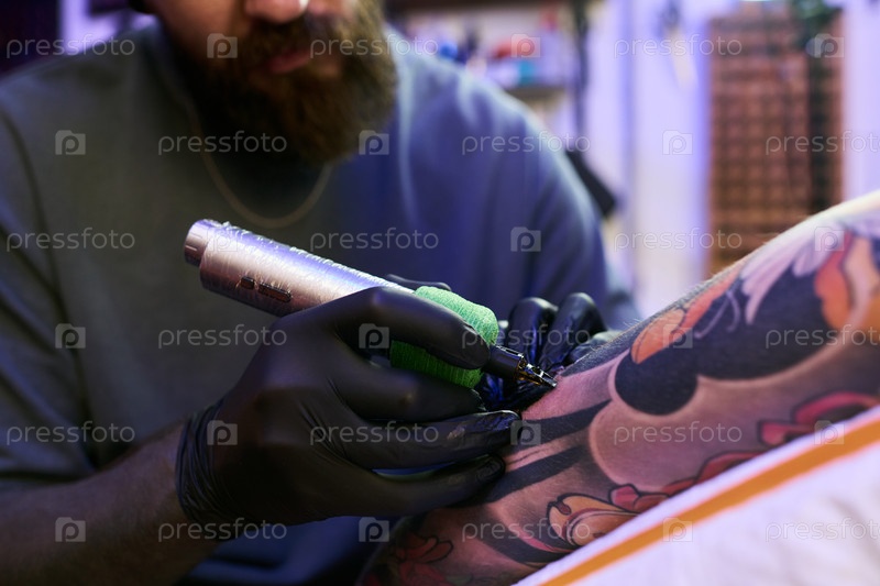 Художник-татуировщик молодого взрослого мужчины создает тату на ноге клиента