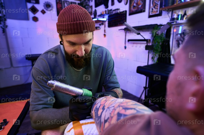 Бородатый молодой человек фокусируется во время нанесения татуировки на ноге клиента