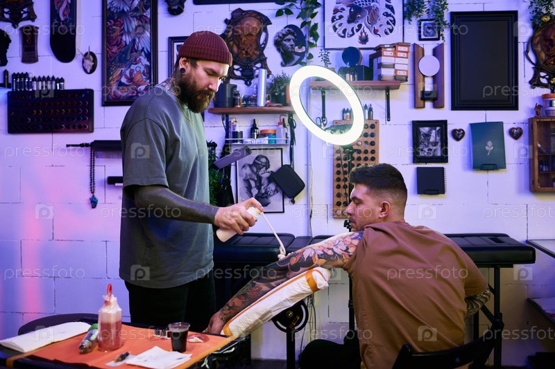 Татуировщик готовит руку молодого взрослого мужчины в современной студии