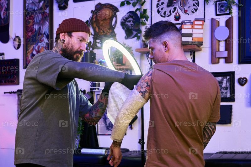 Татуированный молодой человек получает татуировку на руке от тату-артиста в помещении