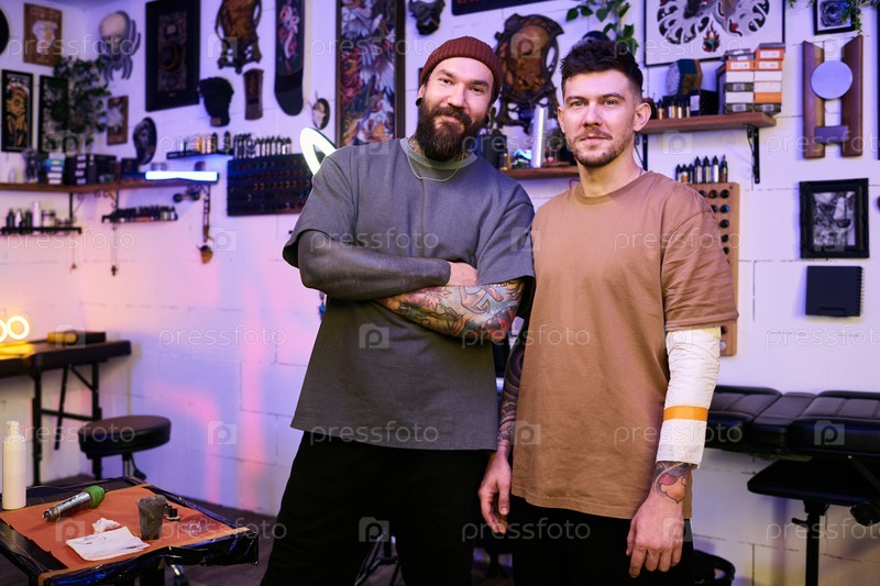 Два молодых человека, стоящих вместе в тату-студии и улыбающихся