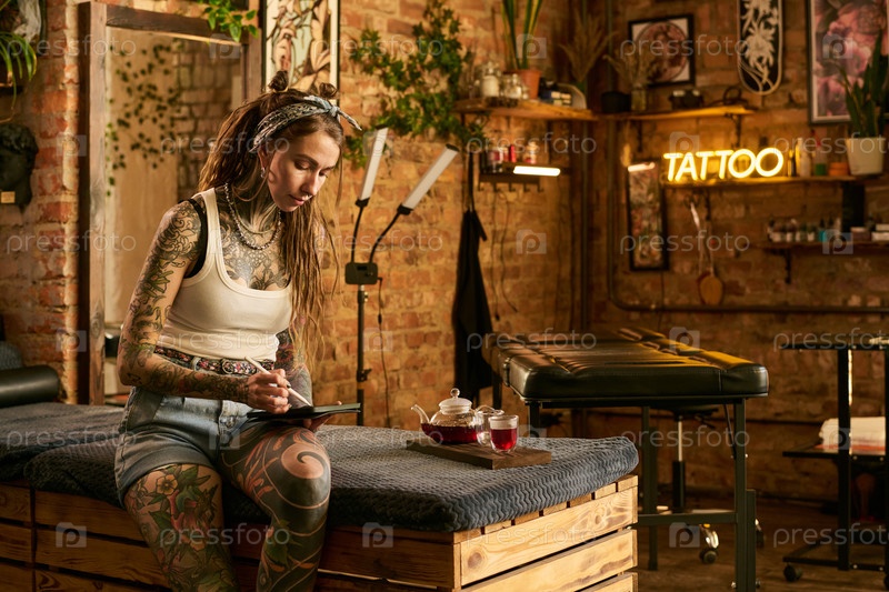 Молодая женщина с татуировками рисует эскизы в тату-студии