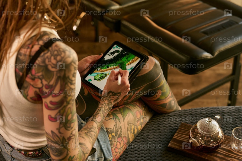 Татуированная молодая женщина рисует цифровое искусство на планшетном устройстве