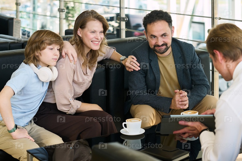 Семейное консультирование с продавцом в офисной гостиной автосалона