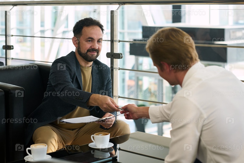 Молодой взрослый человек вручает визитную карточку мужчине средних лет в дилерстве