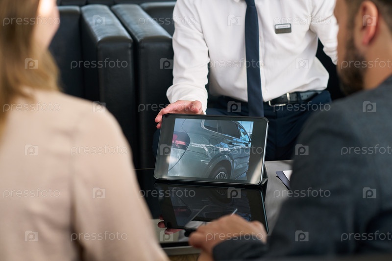 Молодой взрослый мужчина показывает изображение машины на планшете паре в автосалоне