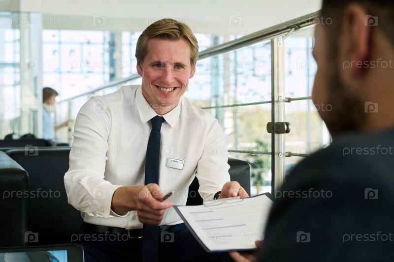 Молодой взрослый мужчина улыбается, передавая контракт клиенту в помещении