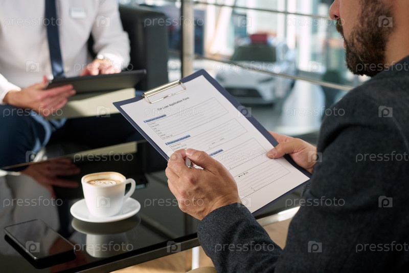 Мужчина средних лет подписывает договор купли-продажи автомобиля в дилерском офисе